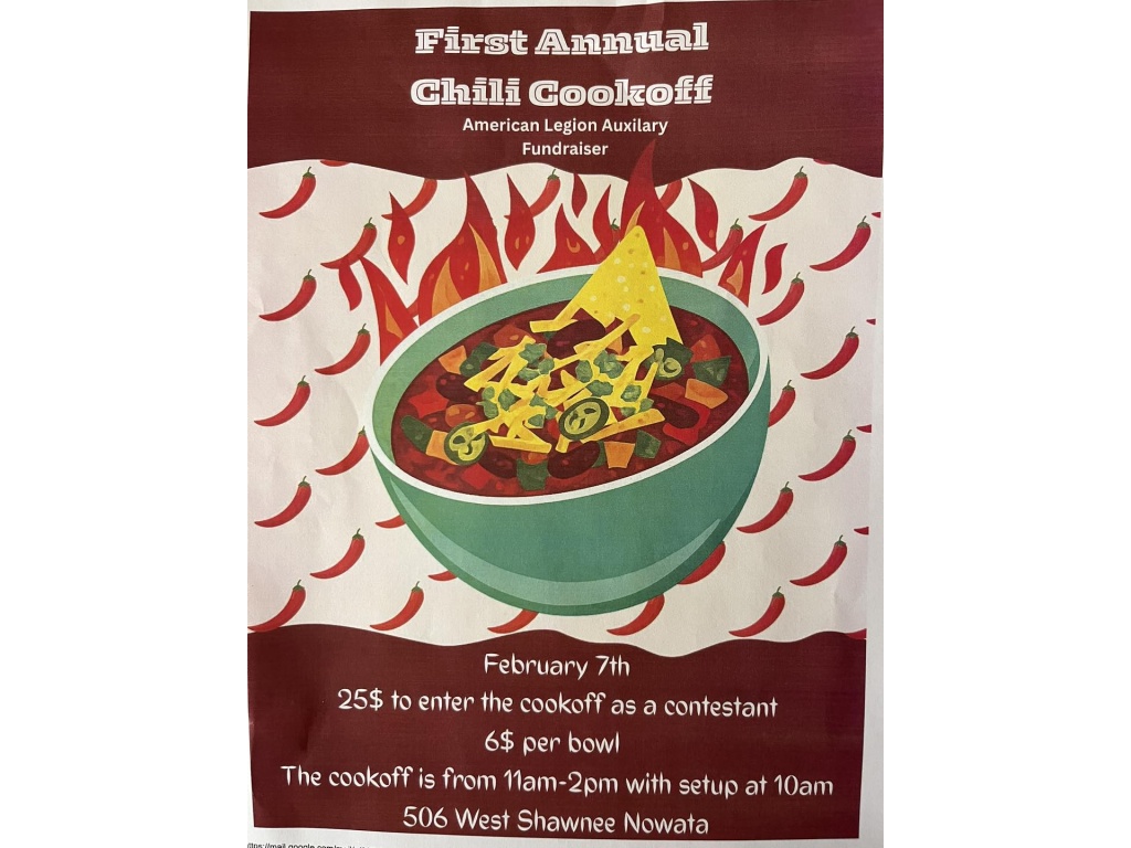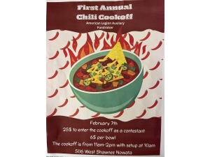 The American Legion Auxiliary hosts its First Annual Chili Cookoff as a fundraiser on February 7th at 506 West Shawnee, Nowata. Contestants pay $25 to enter, with setup at 10am and the cookoff beginning at 11am. Attendees can sample chilis for $6 per bowl. This event supports the Auxiliary's initiatives through community participation and culinary competition.