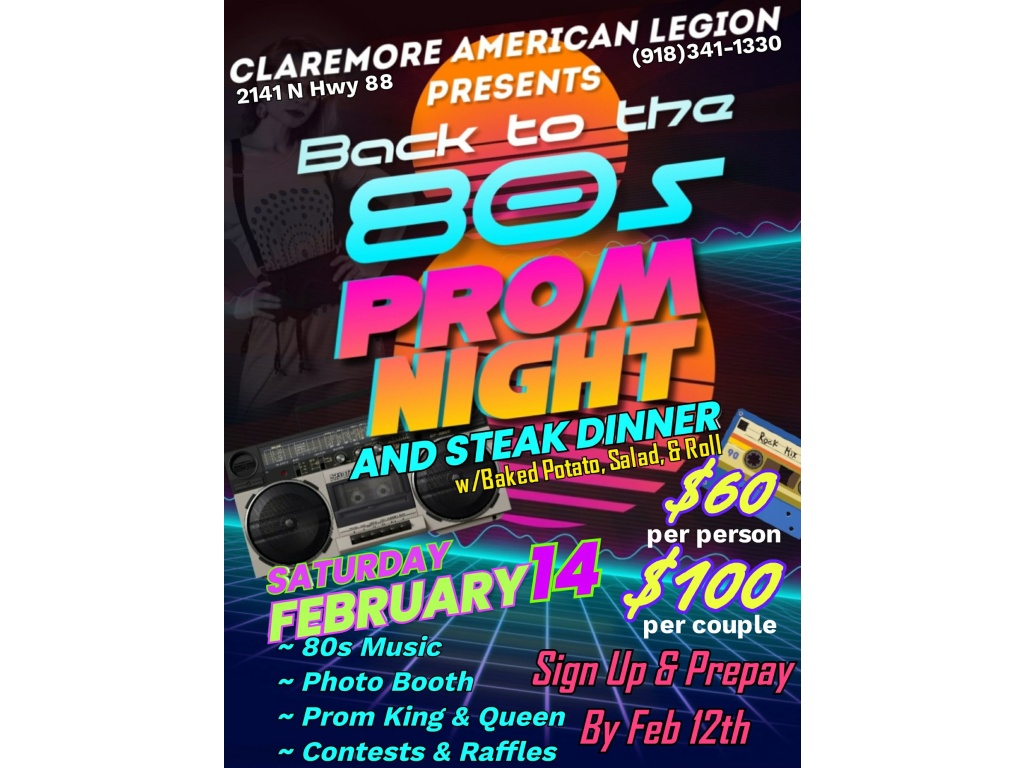 The Claremore American Legion hosts Back to the 80s Prom Night on Saturday, February 14. The event includes a steak dinner with baked potato, salad, and roll. Enjoy 80s music, a photo booth, prom king and queen contests, and raffles. Pricing is $60 per person or $100 per couple. Sign up and prepay by February 12. Held at 2141 N Hwy 88, Claremore. This themed event offers a nostalgic evening of dining and entertainment.