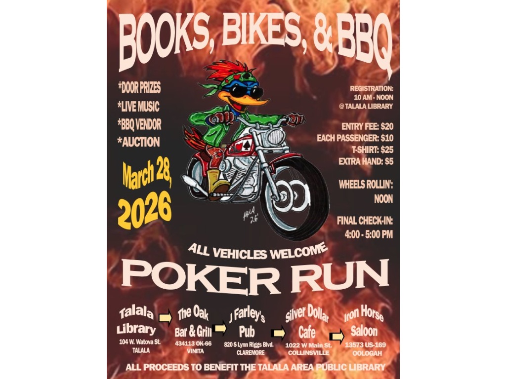 Join the Poker Run fundraiser on Saturday, March 28, 2026, to support the Talala Area Library Friends! This exciting motorcycle event combines riding with poker for a fun day out. Ride to various stops, draw cards, and aim for the best hand while helping your local library community. All riders welcome!