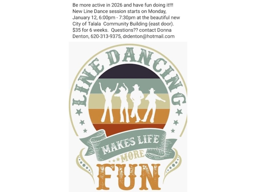 The new line dance session begins on Monday, January 12, from 6:00pm to 7:30pm at the City of Talala Community Room, entering through the east door. This 6-week program costs $35 and aims to help participants be more active while enjoying line dancing. The initiative emphasizes making life more fun through dance. For questions, contact Donna Denton.